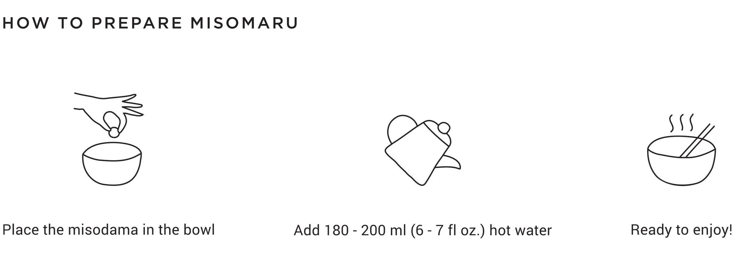 It’s super easy with only 3 steps to make MISOMARU miso soup! Pick your favorite ball, place it in a cup, and pour about 6 fl oz. - 7 fl oz. (180ml to 200ml) of hot water. Adjust the amount of water according to your taste. The instructions are also included in the box.